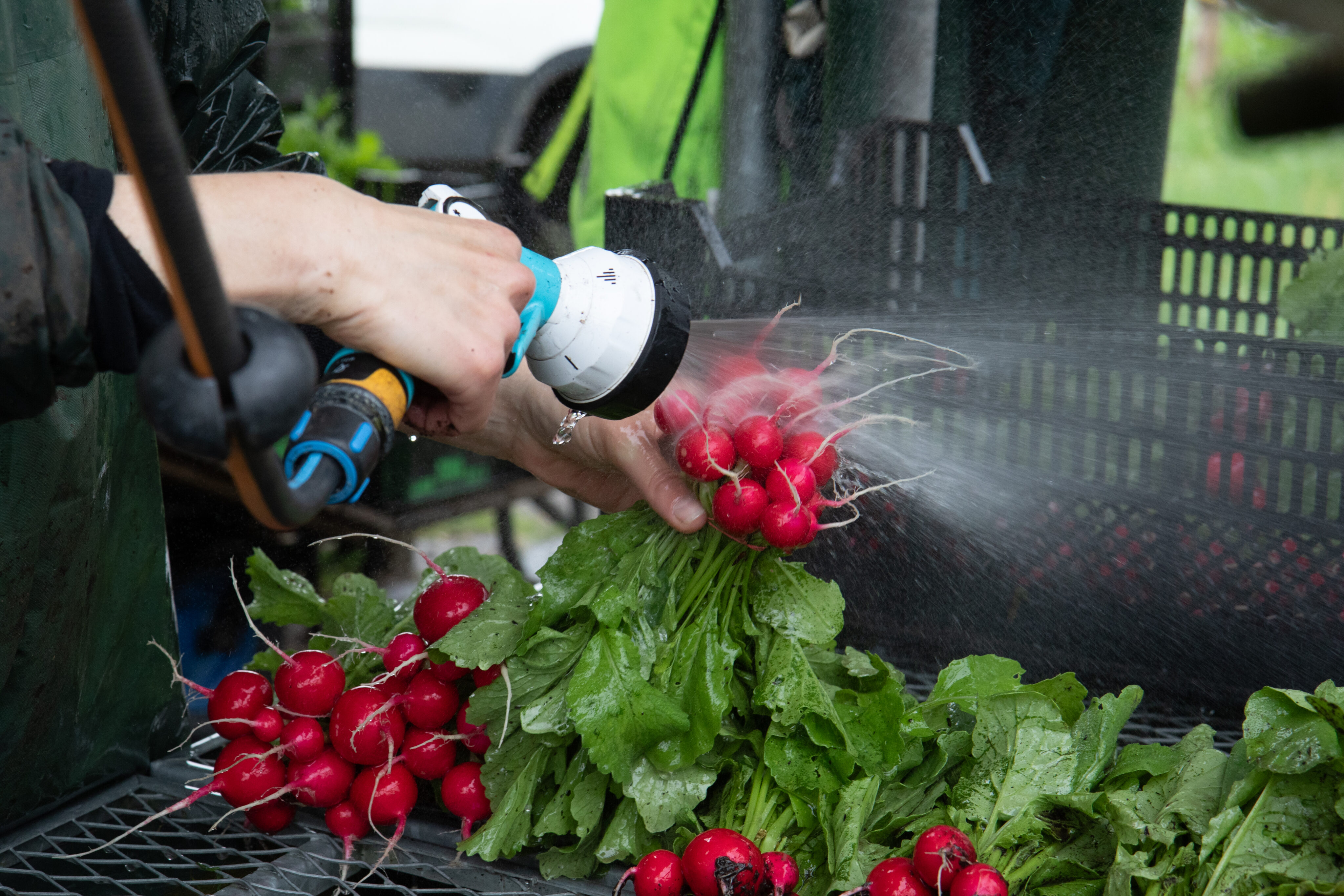 In spring, leafy greens are the first to be harvested, as they grow quickly and thrive in cooler conditions. These early baskets are full of vibrant greens, complemented by vegetables grown over winter in our unheated greenhouses — like young, crunchy carrots and fresh garlic. Our greenhouses help us gently extend the growing season, allowing certain vegetables to arrive earlier and remain available later than they would outdoors.